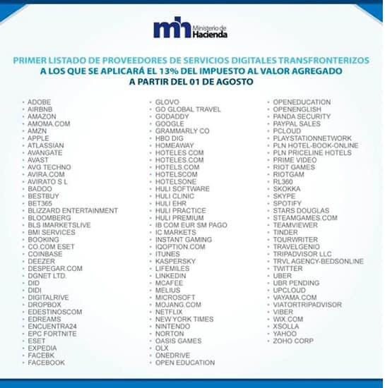 Ministerio de Hacienda pública lista de servicios digitales transfronterizos sujetos al 13% de IVA
